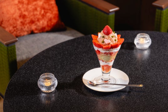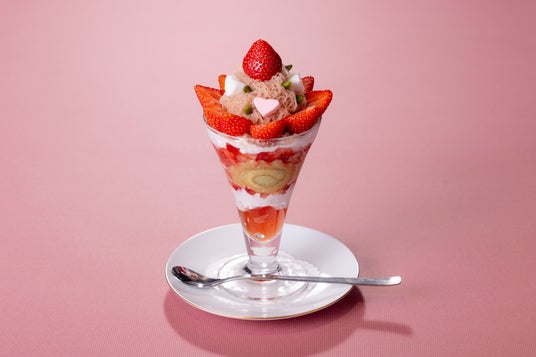 いちごの花束のような「ストロベリーモンブランパフェ」は、フレッシュないちごの果実や濃厚ないちご餡、ぷるぷるとした食感のいちごゼリーなど、様々ないちごスイーツを贅沢に盛り合わせ、口いっぱいにいちごの風味と甘さが広がる一品です。