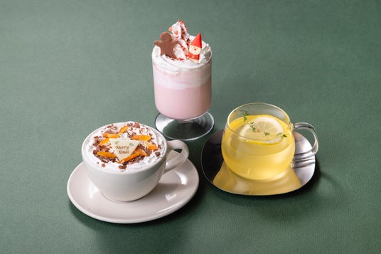 パステルピンクの「ストロベリーショートケーキ」はいちごとクリームブリュレの2種類のシロップをたっぷりと使用したショートケーキをイメージしたドリンク。クリスマス期間には、サンタやお人形の特別なデコレーションでクリスマス気分を演出します。また、雪景色をイメージし、ココナッツとホワイトカカオがふんわりと香るカクテルも登場。さらに、冬の時期に嬉しいホットドリンクとして、ショコラの甘さとオレンジの酸味引き立つ「オレンジホットショコラ」や「ホットレモネード」、そして、パイナップルやオレンジ、レモンなどを使用したフルーティーな味わいのホットワイン「グリューワイン」をご用意します。