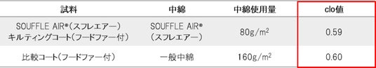 日本女子大学家政学部被服学科衣環境学研究室で「SOUFFLE AIR(R)(スフレエアー)キルティングコート(フードファー付)」と比較コートの保温性能(clo値)を測定。中綿にSOUFFLE AIR(R)(スフレエアー)を使用した「SOUFFLE AIR(R)(スフレエアー)キルティングコート(フードファー付)」は、一般中綿(比較コート)の半分の使用量で同程度の暖かさとなることが確認されました。
