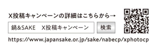 内容:日本酒造組合中央会公式Xアカウントをフォローの上、応募期間中、ご自宅での「鍋と日本酒」の写真をご自身のX(旧twitter)に「#鍋andSAKE」を付けて投稿いただきます。投稿者の中から抽選で20名に全国各地の鍋に合う日本酒をプレゼントいたします。