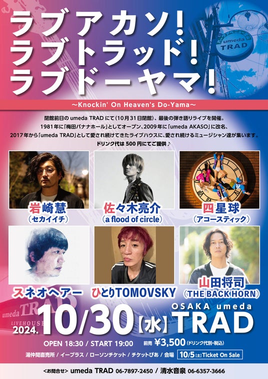 大阪のライブシーンを支えてきた大阪・梅田の老舗ライブハウス「umeda TRAD」が10月いっぱいで閉館。連日、様々なアーティストがライブを繰り広げる中、ラスト2日間はTRADと特に縁のあるアーティストやバンドが集結し、最後のライブが行われます。