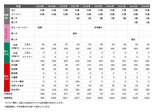 収入については、年代ごとの働き方・年収等の項目、支出については、生活費・車・住居費等の項目が設定可能です。