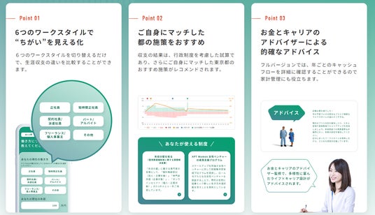 ライフイベントや働き方の変更による生涯収支への影響を簡単に試算できるツールです。試算の結果をグラフで表示するとともに、収支改善や働き方等のアドバイスの提示、活用できる都の支援策を紹介します。