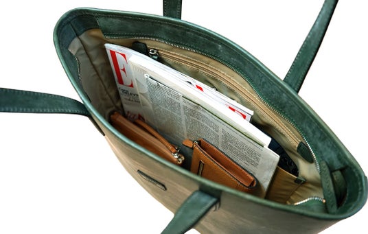 収納容量はご覧の通り、タブロイド版の書類や雑誌にA4ファイルもしっかり入ります。財布や名刺入れなど1日の必需品が十分収納可能です。