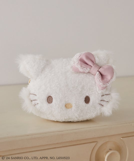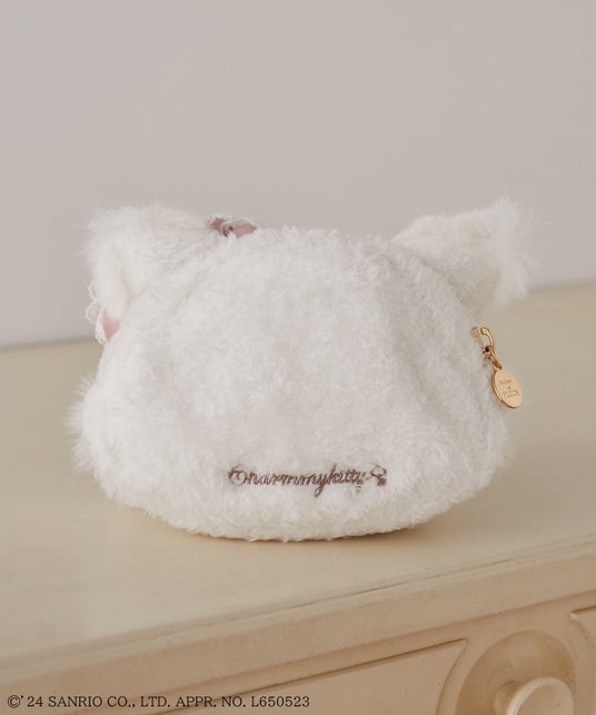 ふわふわのファー素材を使用したフェイスポーチは、チャームポイントのレース付きリボンも再現したこだわりデザイン。背面に刺繍した「チャーミーキティ」のロゴとトレードマークの宝石箱の鍵もポイントです。