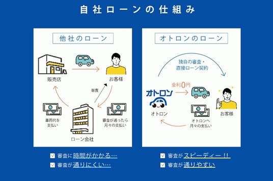 中古車を購入する際、信販会社のローン契約を利用し分割購入手続きを行うことが一般的ですが、オトロンの「自社ローン」ではオトロンとお客様の間で、直接分割払い手続きを行います。