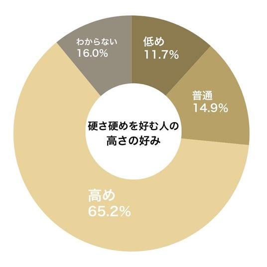 12万件の睡眠統計データによると、硬さ硬めの枕を好む人は、枕の高さは「高め」を好む傾向にあり、敷き寝具も硬めを好む傾向にあります。硬めの寝具は、体が沈み込まないため、枕が相対的に低く感じやすくなるため、しっかりと高さを感じられる、「7cm」に設定しています。