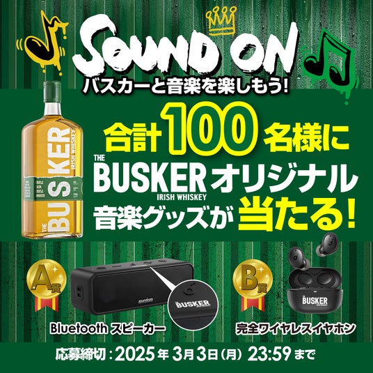 株式会社ウィスク・イー(東京都千代田区 代表取締役社長 遠山公隆)は、同社が輸入代理店を務めるアイリッシュウイスキー『バスカー アイリッシュウイスキー』(以下、バスカー)のキャンペーン、「SOUND ON バスカーと音楽を楽しもう!」を展開します。