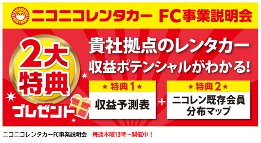 ニコニコレンタカーは「生活レンタカー」を標榜し、日本全国に1,446店舗を展開する格安レンタカーサービスです。手軽に、そして安心して利用できるレンタカーサービスとして多くの人々に選ばれています。ニコニコレンタカーは観光・ビジネスだけでなく、生活圏での日常利用もターゲットとしており、「車は所有から利用へ」という消費者ニーズにも対応しております。多様な車種を取り揃え、人気ハイブリッド車や商用バンなど、さまざまなニーズに応える車両ラインナップを提供しています。さらに280万人の会員を抱えるニコニコレンタカーはどのような商圏でも一定の会員数を担保できます。そして顧客の囲い込みと店舗業務の簡素化を同時に実現した、予約システム「ニコパス」を会員様にご利用いただいているため、ほかのレンタカーサービスと比較しても集客しやすくなっている点も特徴です。