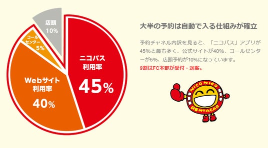 予約チャネル内訳を見ると、「ニコパス」アプリが45%と最も多く、公式サイトが40%、コールセンターが5%、店頭予約が10%になっています。利用者の9割はFC本部が受付・送客!