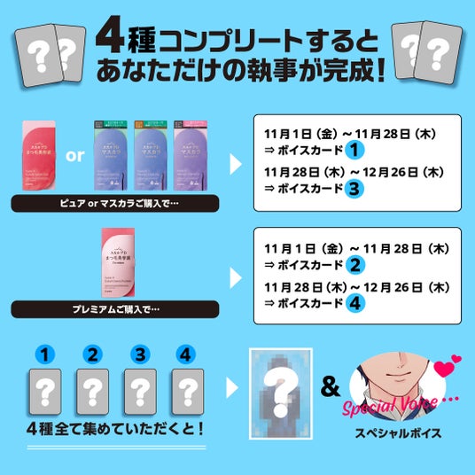 ※ 4種ボイスを集め、Questant(アンケートツール)にて購入証明を送っていただいた方の中から、希望される方は抽選で直筆サインカードをプレゼントいたします。詳細はブランドサイト内の“TOPICS”よりご覧ください。