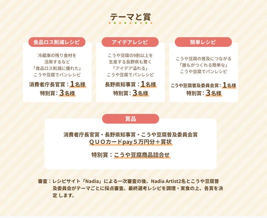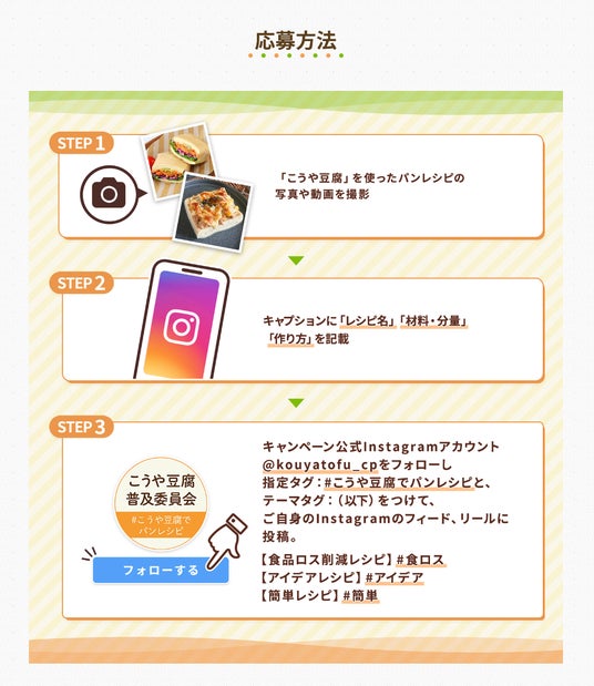ヘルシーでボリューム満点なこうや豆腐を、パンの代わりに使ったレシピを大募集!サンドイッチはもちろん、ピザ、スープグラタン、フレンチトーストにスイーツなど、自由な発想の「#こうや豆腐でパンレシピ 」をInstagramでご応募ください。#こうや豆腐でパンレシピの中でも、「食品ロス削減」につながるレシピ、その手があったか!の「アイデア」レシピ、誰でも作れる「簡単レシピ」の3テーマで審査し、賞を決定します。