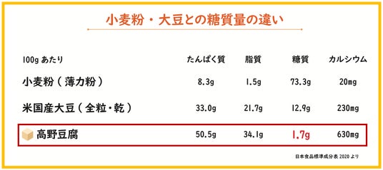 低糖質!糖質量は小麦粉の約1/40。糖質の摂り過ぎは、糖尿病や肥満に繋がる恐れがありますが、高野豆腐は、穀物類やいも類などと比べても、糖質の量が非常に少ないのが特徴。お菓子作りなど、小麦粉の代わりに高野豆腐を使うことで、無理なく糖質をカットできるほか、お肉の代わりとして使うこともできるので、アレンジ次第で、さまざまな健康レシピに活用いただけます。