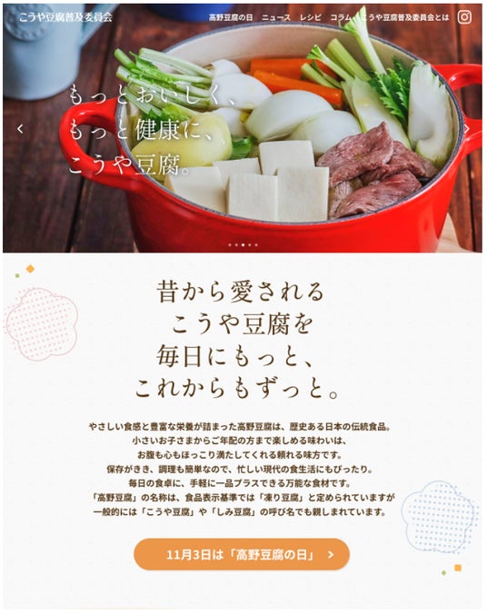 全国凍豆腐工業協同組合連合会(会長:木下博隆)は、より幅広い方に、日本の伝統食材であり、栄養満点のスーパーフード「こうや豆腐」の魅力を知っていただくため、「こうや豆腐普及委員会」サイトをリニューアルいたしました。新サイトには、知って得するこうや豆腐のコラムや、昨年開催のレシピコンテストの入賞レシピなど、こうや豆腐の魅力がギュッと詰まってます。また『11月3日は高野豆腐の日』を記念して、今年もレシピコンテストを開催!昨年のグラプリレシピのように、パンの代わりにこうや豆腐を使った「#こうや豆腐でパンレシピ」を大募集!こちらもぜひ、ご参加ください。