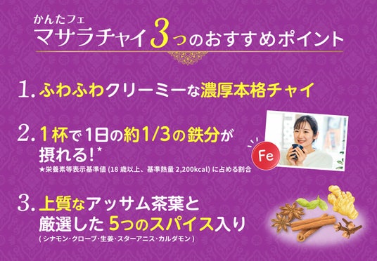 近年、日本でも女性を中心に人気を博しているマサラチャイですが、自宅で材料を揃えて作るのは大変です。『かんたフェ マサラチャイ』なら、お湯に溶かすだけで手軽にお楽しみいただけます。また、不足しがちな栄養素である鉄(Fe)を配合。1杯で1日の約1/3の鉄分※1を摂取していただけます。さらに、「ビタミンC」入りで鉄の吸収をサポートします。