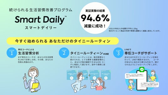 「Smart Daily」は、“健康無関心層”に効果的にアプローチする生活習慣改善サービスです。管理栄養士・保健師等の資格を持つ専属コーチとAIが協力し個々のライフスタイルを分析、モチベーションの波に振り回されず、継続するための行動心理に基づいた”FOGGの行動変容モデル”に基づき、実行可能な「タイニールーティン」を提案、生活習慣の定着までサポートし、フォローアップし続けます。