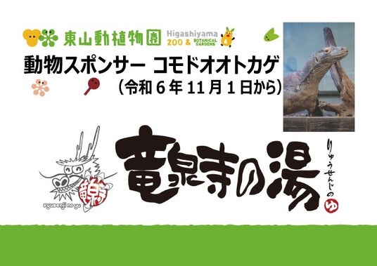 1989年に名古屋市守山区に開業したスーパー銭湯発祥の温浴施設「竜泉寺の湯」と今年7月に東山動植物園に来園した『コモドオオトカゲ(コモドドラゴン)』には“竜とドラゴン”という共通点があり、親近感を感じ、このたびのスポンサー就任に至りました。