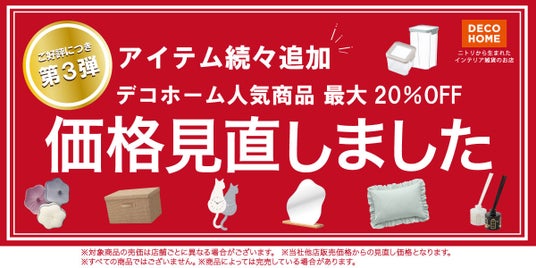 株式会社ニトリ(本社:札幌市北区 代表取締役会長兼社長:似鳥 昭雄 以下:ニトリ)は、2024年10月28日(月)から全国のデコホームとニトリネットで「”第3弾”価格見直し」を実施いたしました。