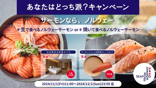 ノルウェーサーモンは、1980年代にノルウェーが国家戦略として養殖したアトランティックサーモンを日本に届け、新しい寿司の楽しみ方として「サーモン寿司」を提案したときから日本で楽しまれています。良質な霜降りのような身が特徴で、生でも新鮮で安心だからこそのまろやかで繊細な風味や、火を入れながらお好みのレア加減で、ジューシーで肉厚なとろける口当たりを楽しむことが可能な満足感たっぷりの万能食材です。ノルウェーサーモンの魅力をより知っていただき、様々なかたちで日常の料理に取り入れていただきたく、本日より「あなたはどっち派?生で食べるノルウェーサーモン派?焼いて食べるノルウェーサーモン派?」SNSキャンペーンを実施いたします。Seafood from Norway日本公式SNS(XまたはInstagram)より参加が可能で、お好みのノルウェーサーモンの食べ方をシェアいただいた方から抽選で、A賞は北欧風ホテルの宿泊(1組2名様)、B賞はノルウェーサーモンフィレ(30名様)をプレゼントいたします。