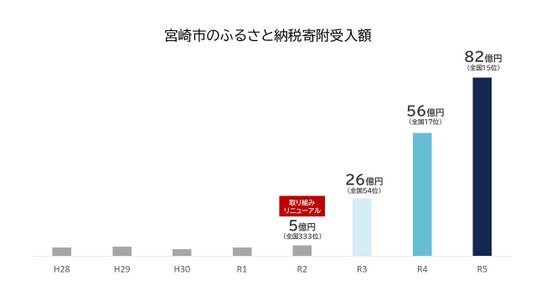 宮崎市のふるさと納税は、令和2年度に取組みをリニューアルして以降、4年間で寄附受入額が20倍に成長し、昨年度には初めて80億円を突破しました。今年度も令和4年度の2.7倍ペースで推移しており、皆様から多くのご支援をいただいております。また、本年市制100周年を迎える宮崎市は、寄附100億円を目標に、寄附者の皆様に満足いただける事業運営に努めています。