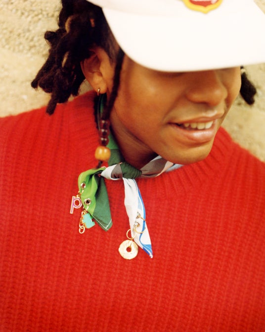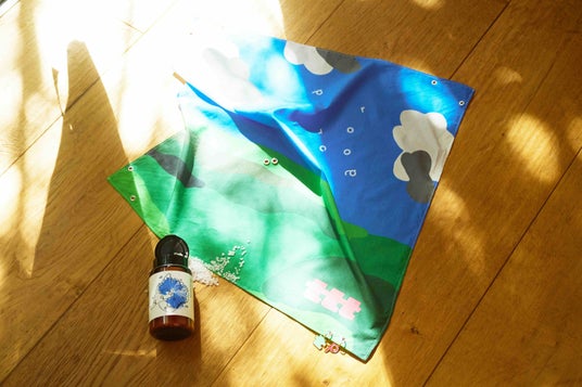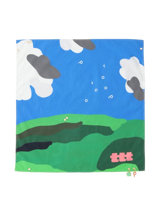 「TTTMSW」玉田氏の記憶に残る情景をグラフィックに落とし込み、「TTTMSW」と「Pororoca」のロゴをあしらったバンダナ。両ブランドのイニシャルである「t」と「P」のチャーム付きで、特別感のあるアイテムとなっています。いたるところにちりばめられたハトメは、付属のチャームを付け替えても、自分自身のお気に入りのチャームを自由に付けてもよい仕様になっています。頭や首に巻いたり、バッグやベルトループに通したり、ファッションのアクセントとしても楽しめます。