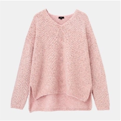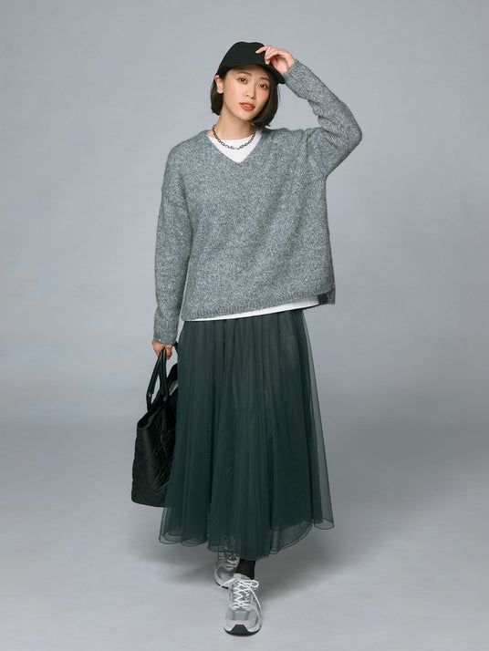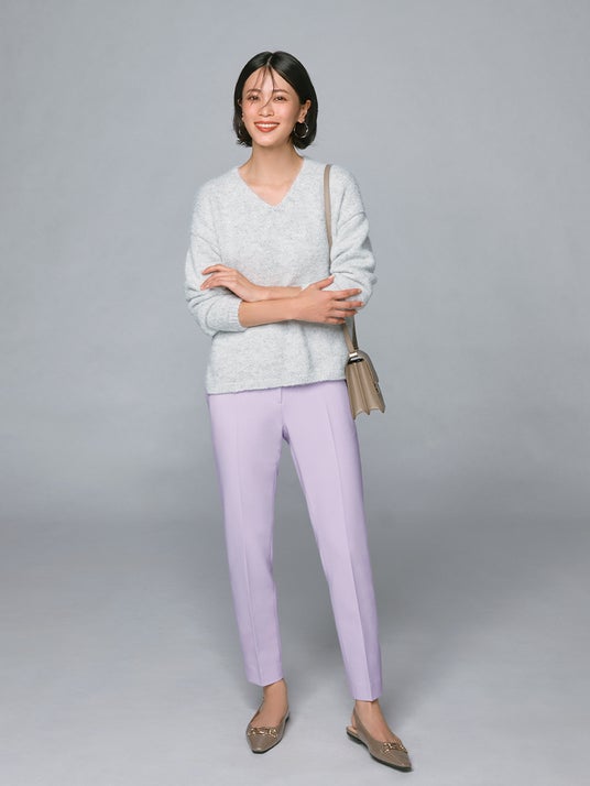 今季はキラキラと輝くラメを使ったニットがトレンドに。プラステの「ラメスパンコールミックスセーター」はさりげなく輝くスパンコールとラメ糸がミックスされた贅沢で華やかなセーターです。ふわっとしたエアリーな質感とデコルテをきれいに見せる浅めのVネックデザインでカジュアルになりすぎず、上品でトレンド感のあるコーディネートを完成させます。ヒップを隠す前後差のあるヘムラインで気になる腰回りもきれいにカバーします。