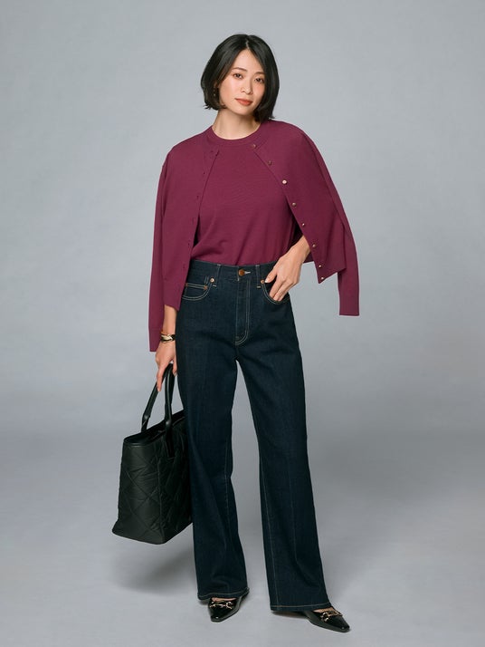 ○ハリのある上質素材のカーディガンはメタルボタンで華やかに