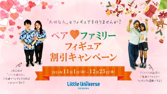 株式会社リトルユニバース(本社:沖縄県浦添市、代表取締役:藍川眞樹)は豊見城市のハイブリッドエンタメ施設「Little Universe OKINAWA」で2024年11月1日(金)からペア、ファミリーサイズのフィギュアが特別価格で作成できるキャンペーンを開催します。