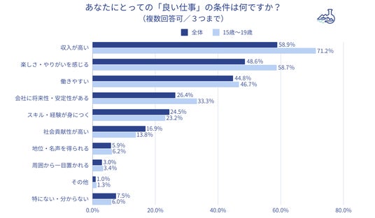 「良い仕事」の条件は、昨年と同様の順位で、「収入が高い」、「楽しさ・やりがいを感じる」、「働きやすい」がトップ3に。特に10代の7割以上が「収入が高い」を選択した。