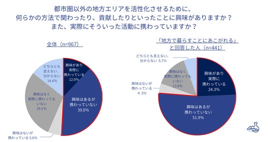– 地方を活性化させるための活動への興味を尋ねると全体では51.0%、地方で暮らすことに憧れる若者に絞ると、76.2%が、興味がある(「興味があり、実際に携わっている」「興味はあるが、携わっていない」)と回答。地方に憧れる人のうち、実際に携わっている人が24.3%いることも判明した。また、東京圏出身の若者では54.1%が「興味がある」(同上)と答えた。