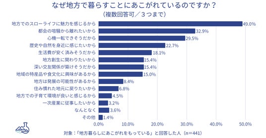 – 地方で暮らすことに憧れる若者は45.6%(「とても憧れる」「まあ憧れる」の計)。理由は多い順に「地方でのスローライフに魅力を感じるから」(49.0%)「都会の喧騒から離れたいから」(32.9%)「心機一転できそうだから」(29.5%)。都会疲れが地方への憧れを生んでいる実態が明らかに。一方、地方に憧れる人のうち、実際に暮らそうと思えない理由は「交通の便」(61.6%)「働き先の有無」(37.2%)「金銭面」(26.7%)と現実的な回答が目立った。