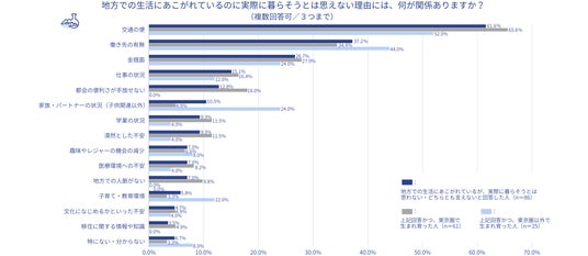 東京圏に住むメリットは、東京圏で生まれ育った若者にとっては交通の利便性、東京圏以外で生まれ育った若者にとっては働き口の多さであることが浮き彫りに。