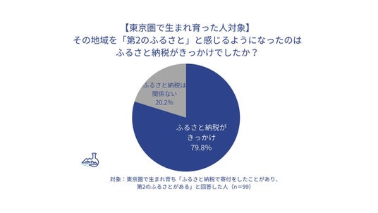 東京圏出身の若者で、ふるさと納税の経験があり、かつ「第2のふるさと」があると答えた人において、約8割が「第2のふるさととの出会いは、ふるさと納税だった」と回答。