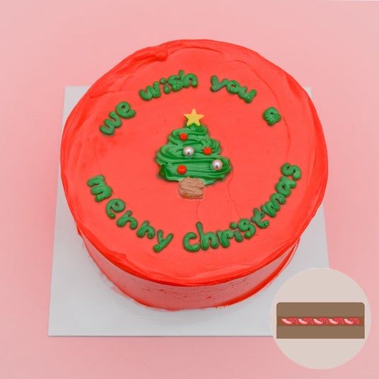 Joyful Christmas真っ赤なケーキにクリスマスツリーのイラスト。クリスマスのお祝いメッセージを添えて。