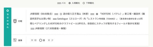 株式会社JR東日本びゅうツーリズム&セールス(本社:東京都墨田区)と株式会社ジェイアール東日本都市開発(本社:東京都渋谷区)、VERTERE(バテレ)合同会社(本社:東京都西多摩郡、以下VERTERE)は、奥多摩エリアの地域活性化と魅力発信を目的とした特別なバスツアーを発売しています。VERTEREの醸造所見学と特別な体験、沿線ガストロノミー「レストラン時帰路(TOKIRO)」での奥多摩の食文化と素材を生かした特別なランチをご提供します。ぜひこの機会にご参加ください。