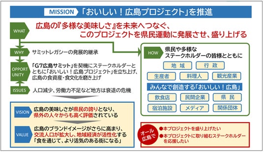 「おいしい!広島」プロジェクトは、「広島が美味しさの宝庫である」というブランドイメージの向上を目指し、広島ならではの多彩な食の魅力を磨き発信していくことで、広島の食文化の発展的継承につなげていく取組です。