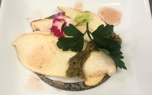 フランスのモン・サン=ミッシェル市との食の交流事業を通じて生まれたメニューで、吉和のあわび茸、津田の苺、玖島葱、宮島の牡蠣など廿日市市産の自慢の食材を使用したあわび茸のマリネです。ランチや懐石料理の箸染めとしてお出ししています。