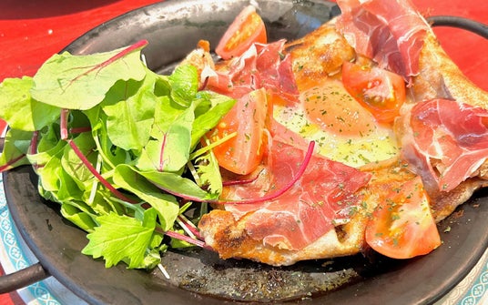 生ハムの塩分と半熟卵のまろやかさの調和、カリッとした生地が自慢です。