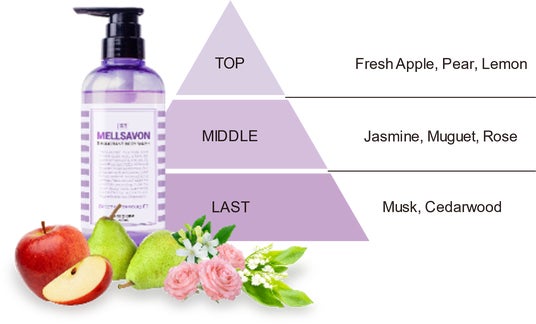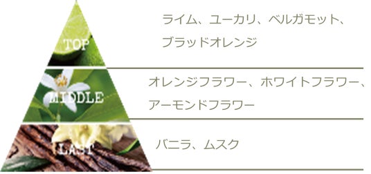 ・スイートホワイトブーケアップル、ペアーなどのフレッシュなフルーツの甘い香りと、ジャスミン、ミュゲ、ローズなどのホワイトフローラルの華やかな香りが優しく広がる、フルーティーで華やかな香り