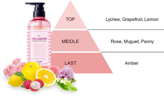 ・フレッシュフルーティーフローラルライチやグレープフルーツなどのジューシーな果実とローズ、ミュゲ、ピオニーなどフローラル系の香りが爽やかに広がるフレッシュな香り