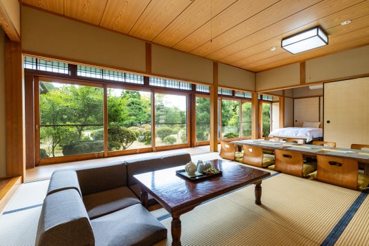 日本庭園と能舞台を眺めながら宿泊できる広々とした客間