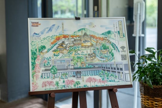 関西セミナーハウスの構内図。近代的な建物である本館を抜けた先にある、日本庭園が広がる別館エリアに能舞台が悠然と佇む。