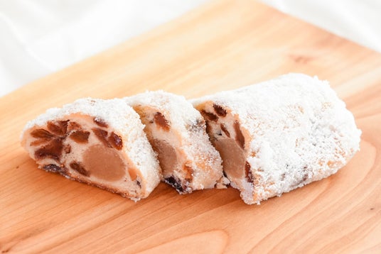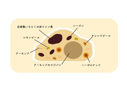 5種類のドライフルーツ(レーズン、いちじく、グリオットチェリー、オレンジ、レモン)と、アーモンドナッツやヘーゼルナッツを贅沢に使用した、シェ・シバタオリジナルシュトーレン。