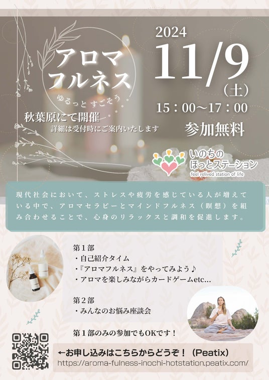 2024年11月9日、いのちのほっとステーション(東京都千代田区)は、アロマフルネスを開始します。この新サービスは、「アロマテラピー」と「マインドフルネス」を通じて、呼吸と心を整えてリラックス法を身に着けることを実現したいと思います。詳細は[https://aroma-fulness-inochi-hotstation.peatix.com]にてご確認いただけます。