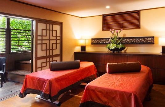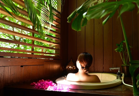 島胡椒と秋ウコン、島塩の琉球スパイスボールを使って身体を芯から温めほぐす90分のボディケアコースは、その香りと温熱で自律神経を整え、背面とヘッドマッサージのあとはテラスバスで温浴を。