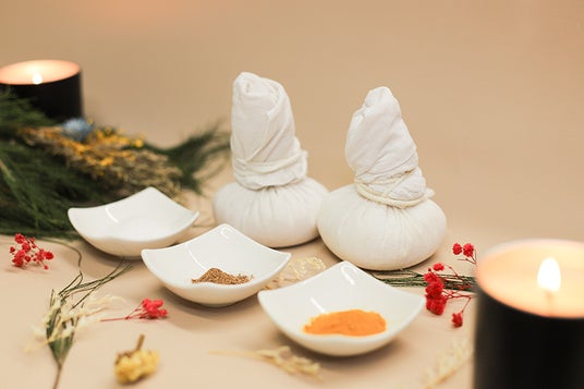 身体を芯から温めほぐすボディトリートメントコース。温めた琉球スパイス(島胡椒、秋ウコン、島塩)ボールの香りと温熱で自律神経を整え、疲れやだるさを解消します。