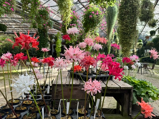 晩秋の宝石のような花ダイヤモンドリリー(ネリネ)は、南アフリカ原産のヒガンバナ科ネリネ属の球根植物です。陽の光を受けると花弁がダイヤモンドダストのようにキラキラと輝くことから、ダイヤモンドリリーとも呼ばれています。花言葉は「また会う日を楽しみに」「忍耐」「箱入り娘」。「ネリネ」はギリシア神話に登場する美しい女神・ネーレーイスに由来してつけられた名前で、ネーレーイスは美しさのあまり⽗神から大事にされすぎて、水底に閉じ込められて育った女神たちで、全部で50~100人もいたのだそうです。