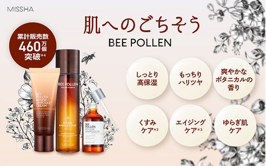 *1 保湿成分:花粉エキス、ローヤルゼリーエキス、プロポリスエキス *2 乾燥による *3 年齢に合ったうるおいケア *4 全世界におけるミシャ BPシリーズ全商品の累計販売数量/販売期間:2018.04~2024.06