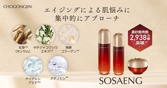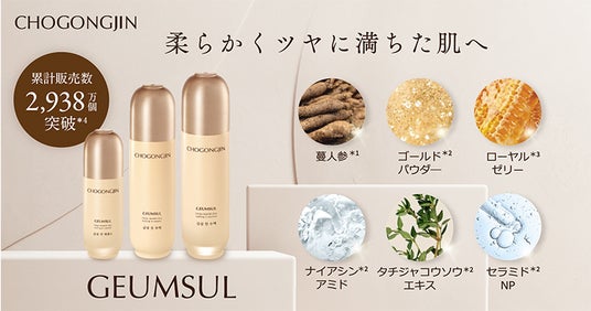 *1保湿成分:オタネニンジン根エキス *2 保湿成分 *3 保湿成分:水溶性コラーゲン *4 2015年~2023年5月 全世界におけるチョゴンジン全シリーズ累計販売数量
