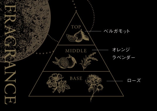 トップノートはベルガモット、ミドルにオレンジ・ラベンダー、ラストはローズと、ストーリーのように展開する豊かな香り。毎日を魅惑的に、ラグジュアリーに彩る独自の配合です。